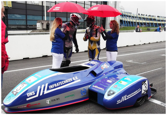 Voor de start werd er zenuwachtig naar het weer gekeken; zou het droog blijven of toch gaan regenen. Daardoor wisselden verschillende teams nog snel van regen naar opgesneden slicks of andersom. De regen banden bleek na afloop de beste keuze. Het Keppel Sidecar Team was op opgesneden profielloze banden vertrokken, maar kwamen op de natte startplek niet goed weg na groen licht en gingen als 13e de eerste bocht in. Toch haalde Jarno met de nieuwbakken passagier Tonnie, ze hadden samen nog geen 20 ronden gereden(!), iedere ronde zijspannen in en lagen in de zesde van twaalf ronden op de 5e plaats. Op de eerste plaats reed de Duitser Dieter Ellers, met in zijn kielzog Kees Kentrop en de Fransman Remy Guignard. Op de vierde stek reeds Bennie Streuer eenzaam rond, want ook hij had een verkeerde bandenkeuze gemaakt (achter slick). |