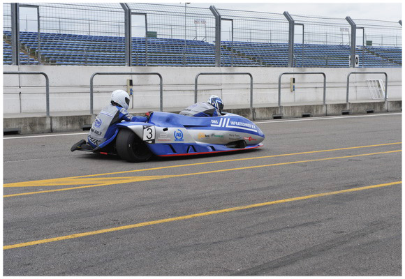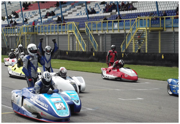 Zondagmiddag, onder perfecte weersomstandigheden (19 graden, zon en nauwelijks wind) stonden 13 zijspannen om 15 uur gereed voor de start over 12 ronden. Het KST span stond op het vuile gedeelte bij de pitmuur. Na het doven van de lichten was Jarno zeer alert en kwam op kop door de Haarbocht. Met de acceleratie en topsnelheid van de Suzuki zit het wel goed en loopt uitstekend.