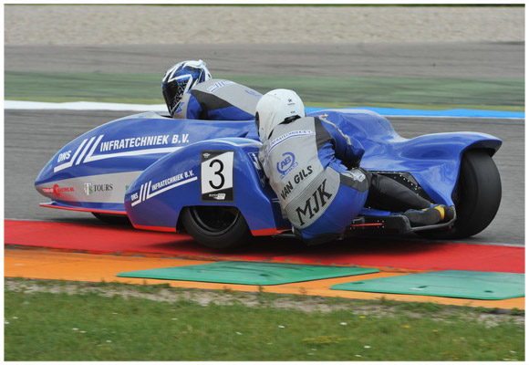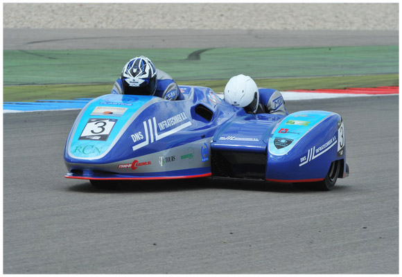 Na donderdag volop getest te hebben, verliep dit weekend alles perfect…tot de 8e van 12 ronden in de race. De eerste training op zaterdagmorgen werd met een voorlopige pole positie met 1.52.741 afgerond. ’s Middags tijdens de tweede kwalificatie waaide het nog steeds erg hard en probeerde Jarno en Tonnie wat andere racelijnen uit. De tijd werd dan ook niet verbeterd. In de een na laatste ronde brak Stekkenwal-uit plots de achterkant van de DNS Infratechniek zijspan weg en was een 360 piroët een gevolg. Bij het achteruit rollen op de baan botste het KST span tegen de combinatie van Wim Barneveld, waarbij Tonnie z’n rechtervoet blesseerde. Jeroen Schmitz viel uit de bak en hield een pijnlijke nek over. Daardoor verbeterde op het laatst Colin Nicholson (1.49.297) en Dieter Ellers (1.51.815) de ochtend tijd van Jarno en Tonnie. Een derde plaats dus op de eerste startrij. WK-bakkenist Gunter Verbrugge was gevraagd bij John Smits in de bak te stappen, want Ferenc vd Weerden bleek een scheenbeen gebroken te hebben in Oss. Deze combinatie trainde zich naar de 5e startplek.