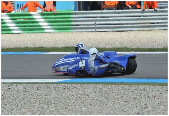 In de 8e ronde, vlak voor het aanremmen van de Stekkenwal, sloeg wederom de pechduivel genadeloos toe en moest Jarno de combinatie in de uitloop van deze snelle rechter bocht zetten. Daardoor geen zekere podiumplek, maar vroegtijdig bezoek aan rennerskwartier. Gunter beleefde wel een podium plaats, want met John Smits werd hij keurig derde. Eerste was Colin Nicholson en tweede Dieter Ellers. Het uitvallen van Jarno met Tonnie was erg jammer en niet op gerekend. Het is en blijft een mechanische sport, waarin tot het uiterste gegaan wordt. Gelukkig staat de agenda een vakantie periode toe, zodat alles wederom getest en geprepareerd zal worden. De volgende wedstrijd is, op de dit weekend tot stand gekomen deelname aan de Gamma Racing Day, op zondag 5 augustus. |