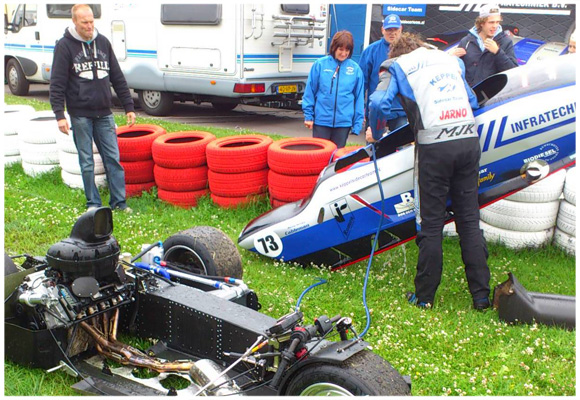 Met snelle rondetijden (snelste 1.49,239) en nu los van het groepje, reed Jarno en Arjen gestaag in, op de 8e plaats liggende Sloveense Remse/Biggs. De DNS-Infratechniek-LCR stuurde als een scheermes, maar Arjen bemerkte al wat olie op z'n pak... Arjen tikte Jarno aan en die dacht, dat het een aanmoediging was, om de laatste 6 ronden, er nog even vol tegen aan te gaan! In de 11e ronde en met zicht op de 8e plaats, ging het faliekant mis in Duikersloot (zuid kant circuit) en knalde het Suzuki blok kapot. Er ontstond rook en direct werd het #73 bij post-17 Meeuwenmeer aan de kant gezet. Daar kwamen de vlammen uit de kuip, wat door olie op de hete uitlaat werd veroorzaakt. Weg einduitslag en mooie klassering!